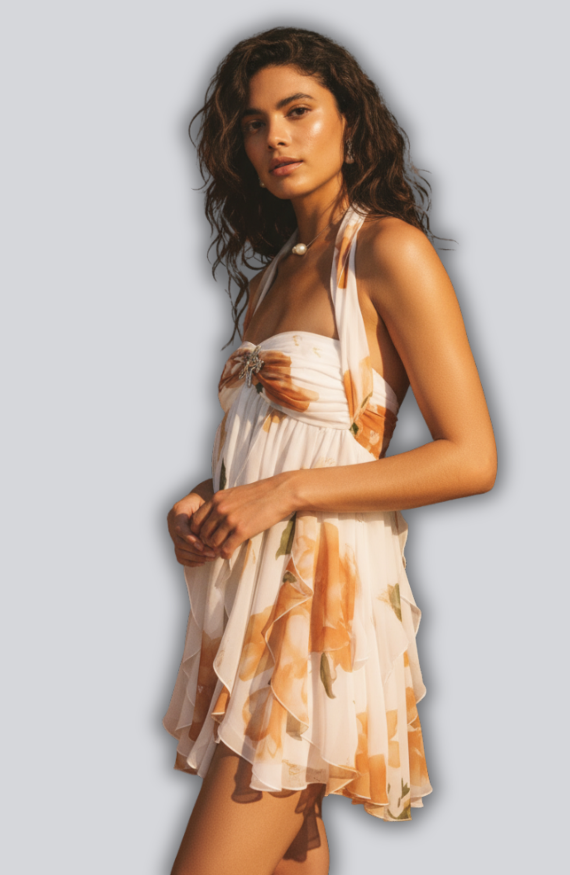 The Aniela Floral Chiffon Mini Dress exudes pure romance – with delicate pastel flowers, an elegant halterneck neckline and dreamy layers of light chiffon. Perfect for garden parties, summer brunches or a glass of rosé in the sun.
